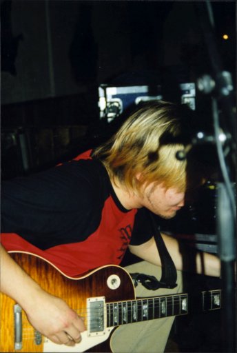 Janne säätää laitteitaan Gibson Les Paul kaulassaan..