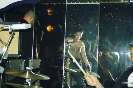 Peilin kautta. Maija juo vettä ja yleisö bailaa.
